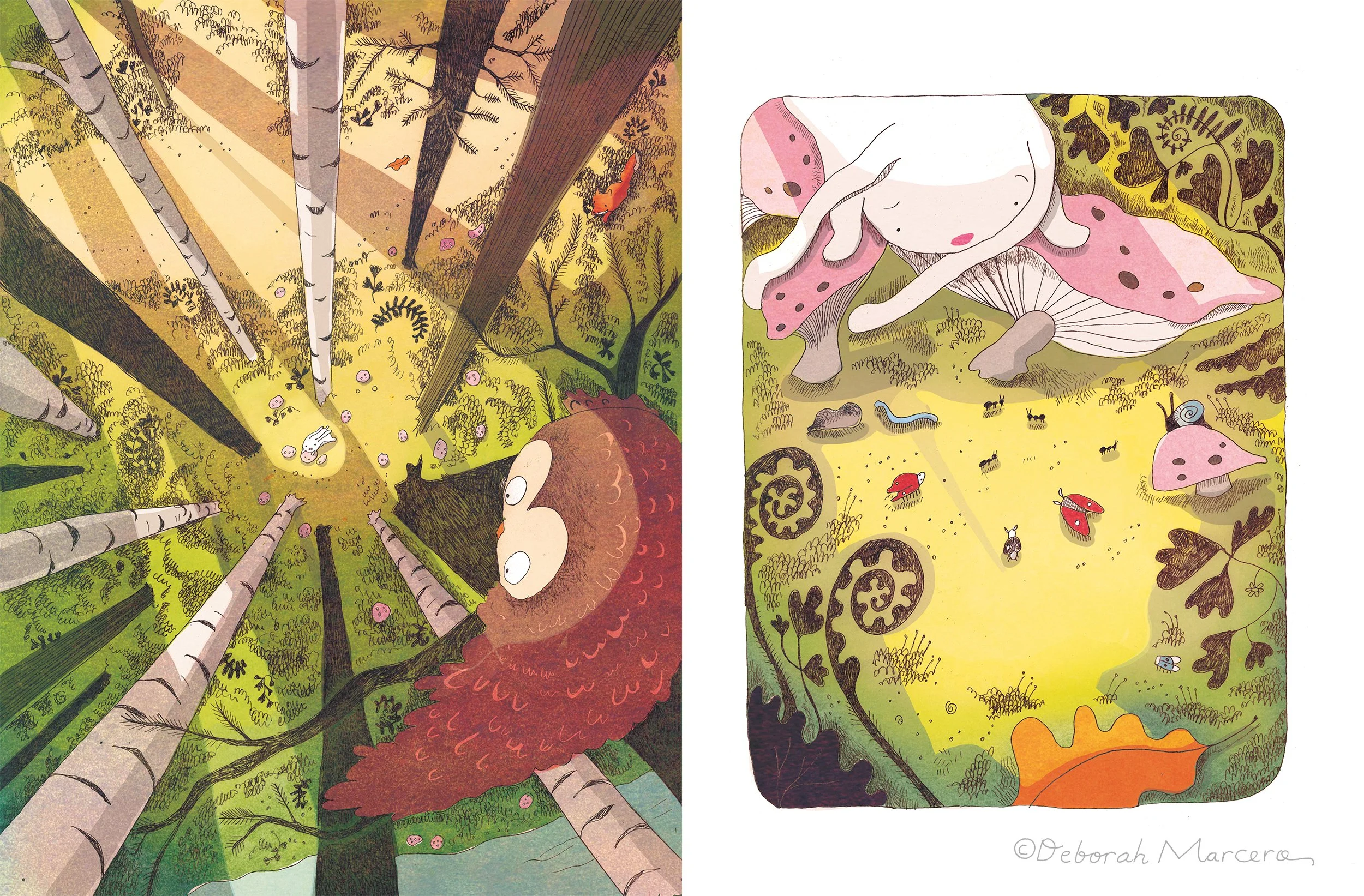 “If you get lost, and you might get lost….” In simple language that speaks directly to us, a magical and soothing story unfolds. A little girl accidentally drops her stuffed bunny out the car window, and the bunny–which has quietly come alive– feels scared. Searching up, down, in, out, and between, it soon finds itself among a group of friendly forest animals, who accompany it on its journey. Together they frolic through the woods and over a stream until the bunny finds itself safely back where it belongs, in the little girl’s arms.